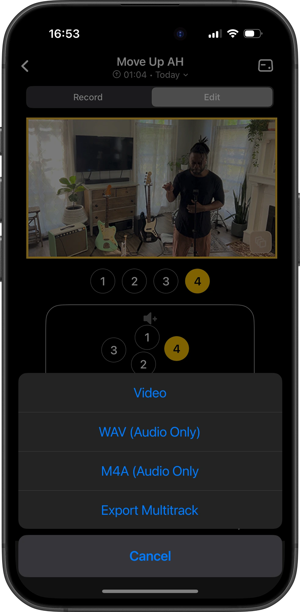 Each microphone captures a separate audio track into a single project that you can then mix and edit right in the app. A video captured with the app at the same time is automatically synced with the audio mix.