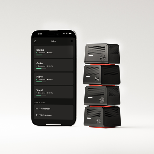 With our latest software update, Audigo can now support recording with up to four of our wireless smart microphones at the same time, all connected to the same iPhone. Our patented multi-sync technology ensures the timing accuracy of your recordings.